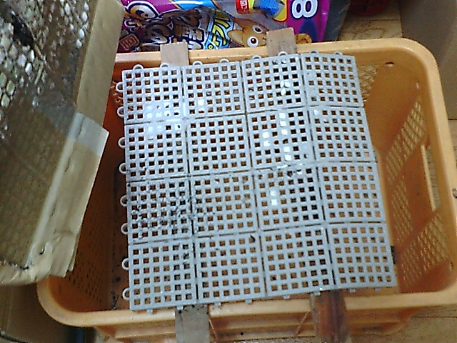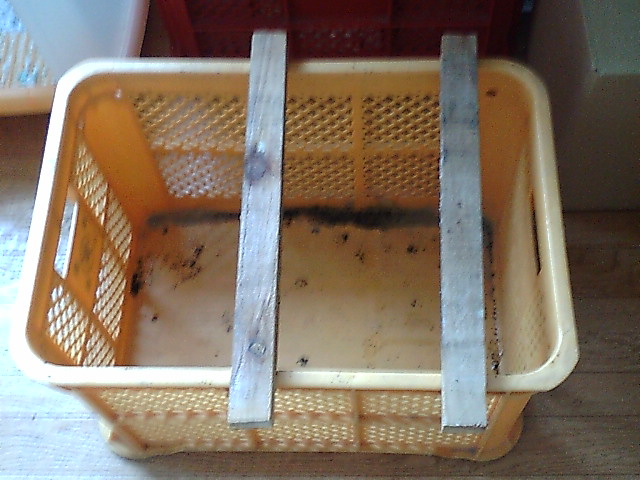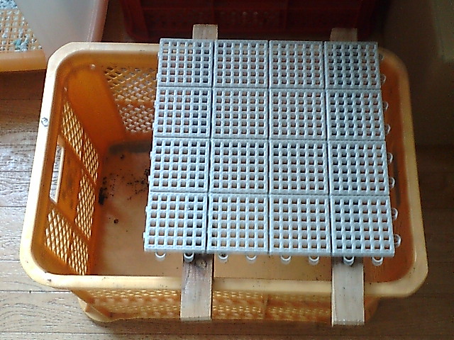 まずは足場つくりから。私の場合はみかんコンテナの上に、木の棒を2本置き、ダンボールをその上に乗せるつもりです。ダンボールの底面は湿気がこもりやすいので、できるだけ空間を空けているほうが良いのです。